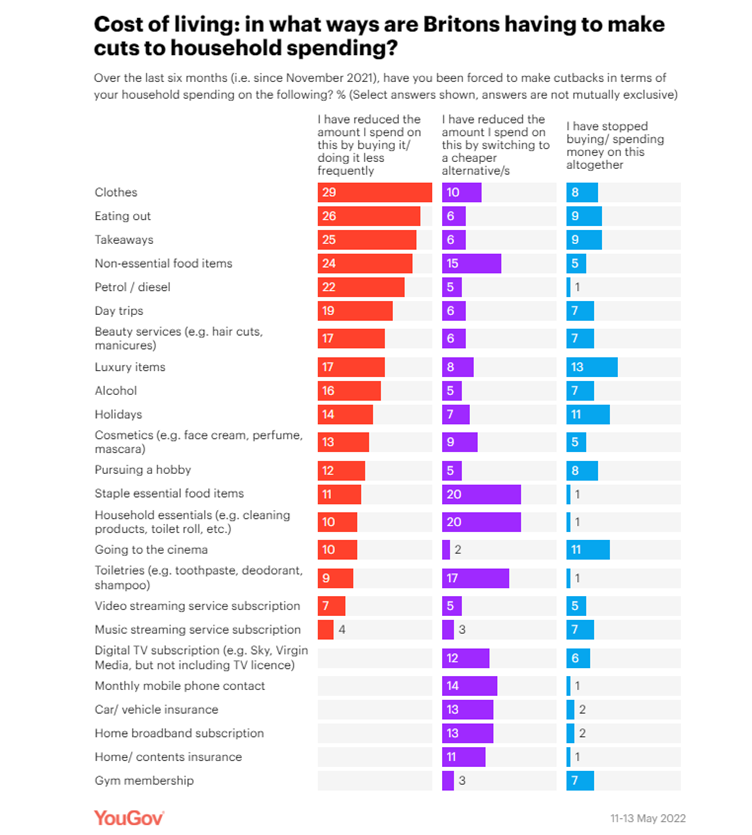 A recent YouGov survey highlights this perfectly. It shows what the country has cut back on and how spending by category has changed in a six-month period.